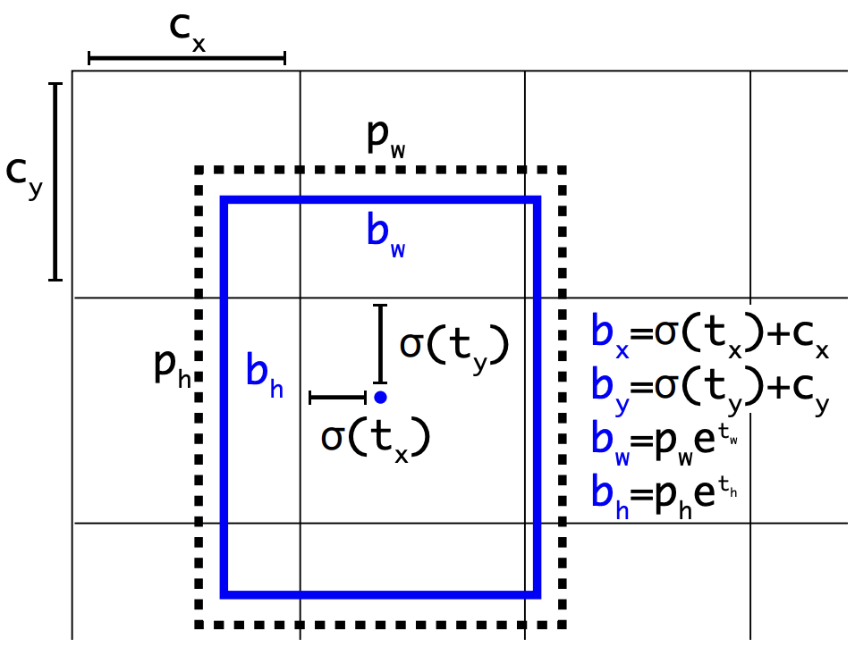 b_x = \sigma(t_x) + c_x, b_y = \sigma(t_y) + c_y → center relative to the cell